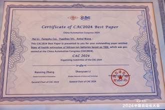 2024年11月1日至3日,由中国自动化学会(Chinese Association of Automation,CAA)主办的2024中国自动化大会(China Automation Congress,CAC2024)在青岛召开。我校银河yh533388史元浩副教授指导的2024级硕士研究生李辉论文“State of health estimation of lithium-ion batteries based on TiDE”经大会评审,被评选获2024年中国自动化大会优秀论文奖(“Best Paper Award”)。